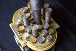 A detail view of the automata sculpture "The Theory of Relativity". It shows the tops of the stacks of coins on the sculpture. Euro coins and American coins are most prominent.