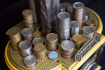 A detail view of the automata sculpture "The Theory of Relativity". It shows the tops of the stacks of coins on the sculpture. Euro coins, British Pound coins, and American coins are most prominent.