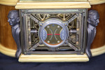 A detail view of the automata sculpture "The Theory of Relativity". It shows two masculine bust figurines on either side of a set of gauges labelled Supply and Yield.