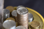 A detail view of the automata sculpture "The Theory of Relativity". It shows a macro closeup of American quarters.