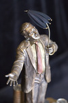 A detail view of the automata sculpture "The Theory of Relativity". It shows the face of the figurine holding his hand out and an umbrella. His clothes are cast in metallic shades of gold and bronze.