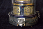A detail view of the automata sculpture "SarBox". It shows more of the decorative gold elements under the ticker tape machine, including laser-cut words reading 'Honesty', 'Integrity', and "Truth'.