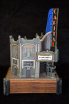 The automata sculpture resembles a movie theatre from the outside, including a ticket box, and opens up to show a tiny theatre screen and seats which would play a message when the automata was running. The theatre marquee shows 'Confusion' as the movie title, and the name of the theatre is Capital.