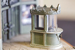 A detail view of the automata sculpture "Confusion". It shows a miniature ticket teller booth with a button on it which would activate the automata if pressed.