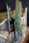 A detail view of the automata sculpture "Confusion". It shows some of the interior décor on the opened automata, with a panel displaying a film reel carved into the surface.