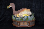 The sculpture resembles a dodo bird sitting on stones surrounded by branches and moss.