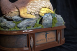 A detail view of the automata sculpture "Survival of the Fittest". It shows some fo the fake rocks, moss, and grass that a dodo bird rests upon, and a jester carved into a bronze plaque. The jester stands among the words Saltator Sepulcri.