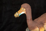 A detail view of the automata sculpture "Survival of the Fittest". It shows the side detail of a dodo bird's face including a green eye, beak painting, and the sculpted feathers on its head and neck.