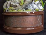 A detail view of the automata sculpture "Survival of the Fittest". It shows a man carved into bronze at the base of the sculpture.