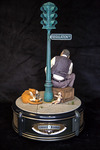 The sculpture shows a man in fabric shirt, vest, and suiting pants sitting on a box in front of a streetlight post. The intersection is for Regulation Road. There is a dog lying at the man's feet and they look at each other. A voodoo doll with a pin stuck into it is behind the crate.