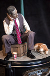 A detail view of the automata sculpture "Think It Over". It shows more of the fabric details on the sculpture of the man, including a red cloth tie, vest, and pants.