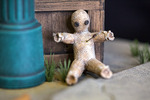 A detail view of the automata sculpture "Think It Over". The front of the voodoo doll is in focus with a pin sticking out of its chest; the dollar sign on the pinhead is out of focus.