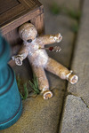 A detail view of the automata sculpture "Think It Over". It shows the voodoo doll from above with a pin sticking out of its chest. The pinhead is a dollar sign in focus.