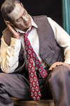 A detail view of the automata sculpture "Think It Over". It shows the fine detail on his red cloth tie, as well as the tiny button details and stitching on his dress-shirt and vest.