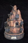 The sculpture features a vertical mining operation with mining tracks in a spiral through the rock. The doors are labelled 'Trust' and mining carts can travel the tracks.