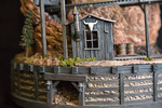 A detail view of the automata sculpture "Tender Credibility". It shows the side of a miner's home figurine with a bull skull mounted above a window and a smokestack.