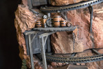 A detail view of the automata sculpture "Tender Credibility". It shows tiny barrels and gears on a platform above a set of mine doors.
