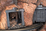 A detail view of the automata sculpture "Tender Credibility". It shows a snarling bear peering out from an opening into the mines.