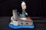 The sculpture features the US Treasury visible from the back, with a man wearing a propeller hat in the shape of Congress's domed building roof holds a firehose spraying water. The hose connects to the treasury. He sits on a money printer. Embedded in the cliff are a factory, home, mom and pop diner, a school, and a barn.