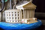 A detail view of the automata sculpture "Quantitative Easing". It shows a closeup of the Treasury Department building at the rear of the automata.