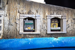 A detail view of the automata sculpture "Quantitative Easing". It shows the factory and tiny white picket fence figurines embedded into the base of the automata sculpture.