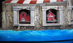 A detail view of the automata sculpture "Quantitative Easing". It shows the school and barn figurines embedded into the base of the automata sculpture.