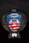 The sculpture is a round globe shape, opening to what resembles a pinball arcade game. One half features symbols reminiscent of the Democrat party, the other the Republican Party. A tiny classical building is positioned at the top of the game and its roof is labeled 'Filibuster'.