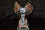 The sculpture is a round globe shape, opening to what resembles a pinball arcade game. One half features symbols reminiscent of the Democrat party, the other the Republican Party. A tiny classical building is positioned at the top of the game and its roof is labeled 'Filibuster'.