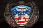 A detail view of the automata sculpture "Consensus" showing the pinball playing field in full with tiny sculptures of an elephant, a donkey, a golden eagle.