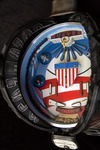 A detail view of the automata sculpture "Consensus". It shows the side of the pinball game featuring elephant and teapot figurines.
