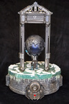 The sculpture features an Atlas-like figure carrying a globe on his back while standing in an ice field. He stands between two pillars atop which is an electronic sign display. The backside of the sign reads 'can you go too low?'