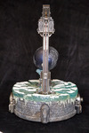 The sculpture features an Atlas-like figure carrying a globe on his back while standing in an ice field. He stands between two pillars atop which is an electronic sign display. The backside of the sign reads 'can you go too low?'