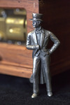 A detail view of the automata sculpture "View From Above" showing a tiny statue of a man in top hat and evening coattails.