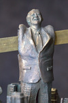 The sculpture features a businessman standing in a miniature cityscape; his arms have been replaced by an oil derrick pump.