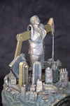 The sculpture features a businessman standing in a miniature cityscape; his arms have been replaced by an oil derrick pump.