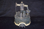 The sculpture features a businessman standing in a miniature cityscape; his arms have been replaced by an oil derrick pump.