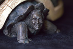 A detail view of the automata sculpture "Liquid Real Estate". It shows a tortoise with a human man's face which holds up one corner of the base of the sculpture.