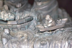 A detail view of the automata sculpture "The Whole World in Our Hands". It showcases a dejected-looking figure sitting crosslegged atop a tiny cargo ship.