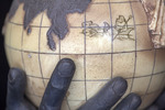 A detail view of the automata sculpture "The Whole World in Our Hands". It showcases art of Poseidon in a fish-drawn chariot drawn on the side of the globe held up as the main focus of the automata sculpture.