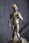 A front detail view of the automata sculpture "The Emperor Has No Clothes".