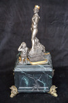 A side view of the automata sculpture "The Emperor Has No Clothes".