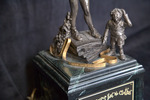 A detail view of the automata sculpture "The Emperor Has No Clothes". It shows a small child at the base of the sculpture. The child figurine points a finger down at a gold ribbon with stock exchange abbreviations on it; their other hand rests on thier head like they're confused or aghast.