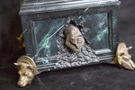A detail view of the automata sculpture "The Emperor Has No Clothes". It showcases a sleeping bear atop some rubble, bursting out of the side of the automata's base. There are gold bull busts on each corner of the automata base.