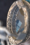 A detail view of the automata sculpture "No Free Lunch". It showcases some reversed, carved letters along the inner frame of a mirror reading 'PERCEPTION' in the mirror's reflection.