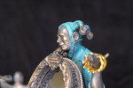 A detail view of the automata sculpture "No Free Lunch". It shows the expression of the automata's largest figurine, and a plaque at the top of the sculpture's mirror reading 'Caveat Emptor'.