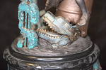 A detail view of the automata sculpture "No Free Lunch". It showcases a multi-window vehicle whose cab is unhinging to show alligator teeth and a tongue. A corroded statue of a dollar sign emerges from the water nearby.