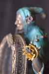 A detail view of the automata sculpture "No Free Lunch". It shows a gold crown in focus held by the sculpture's jester figurine.
