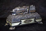A front angled view of the automata sculpture "The Engine That Can".