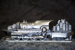 A detail view of the automata sculpture "The Engine That Can". It shows the side of the transportation amalgam so that details of the city, airplane, train, semi-truck, and cargo ship can be more clearly seen.
