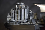A detail view of the automata sculpture "The Engine That Can". It shows a closeup macro view of a miniaturized cityscape.
